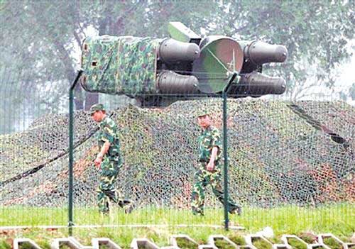 兩名中國(guó)士兵在“鳥(niǎo)巢”附近的防空導(dǎo)彈系統(tǒng)前巡