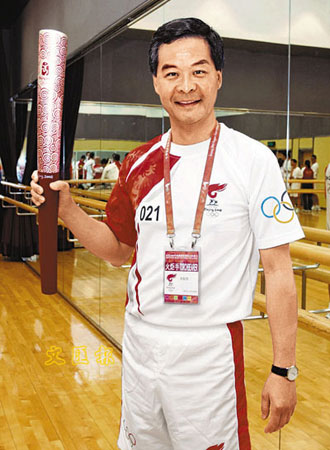 但“我跑完后,那把火炬還未曾返過我寫字樓”,原來梁振英借出奧運火炬及火炬手制服,給一所學校拍照留念并捐款賑災后,家長教師會見狀亦趕忙向他商轉(zhuǎn)借展覽,故火炬兜兜轉(zhuǎn)轉(zhuǎn),直到9日才送回他的辦公室。