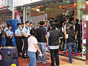 香港警方12日晚展開“雷霆08”反罪惡行動(dòng),拘120人。圖為探員于元朗教育路的一間卡拉OK巡查。(圖片來源:文匯報(bào))