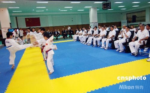 7月14日,29名將執(zhí)法北京奧運(yùn)會(huì)的裁判員聚集在北京什剎海體校跆拳道訓(xùn)練館,參加由世界跆拳道聯(lián)盟組織的奧運(yùn)前的“最后一課”。這也是世跆聯(lián)第一次在東道主國(guó)家舉辦奧運(yùn)前最后一次裁判培訓(xùn)班。圖為裁判員觀看什剎海體校跆拳道運(yùn)動(dòng)員表演。 中新社發(fā) 王東明 攝