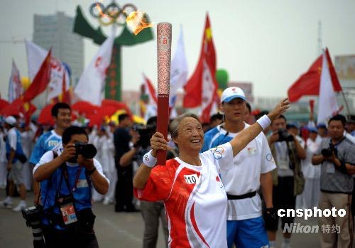 7月15日,出演過《希望的田野》等電影的著名演員柏青在東鎮(zhèn)廣場傳遞完松原最后一棒火炬后,奧運火炬在吉林松原的傳遞結束。 中新社發(fā) 廖攀 攝