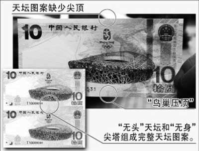 昨天,記者在中國(guó)人民銀行官方網(wǎng)站和新華社等全國(guó)媒體公布的奧運(yùn)紀(jì)念鈔照片中看到,所有紀(jì)念鈔正面的圖案一模一樣,均出現(xiàn)“鳥(niǎo)巢壓頂”情況。將兩張紀(jì)念鈔上下相接,“無(wú)頭”天壇和“無(wú)身”尖頂恰好可以組成一個(gè)完整的天壇圖案。
