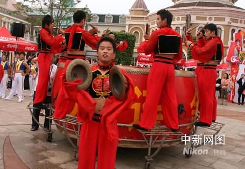 7月19日,北京奧運火炬在大連傳遞,當地民眾敲響威風鑼鼓激情迎接奧運火炬。記者周兆軍攝