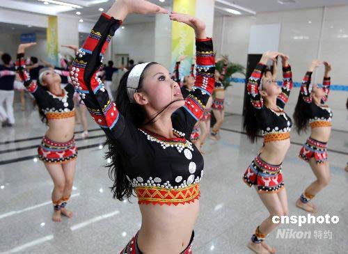 七月二十日,北京奧運會、殘奧會體育展示與頒獎儀式誓師動員大會在理工大學舉行。圖為演出前,參加演出的演員進行緊張排練。中新社發(fā) 任海霞 攝