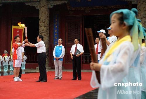 7月22日,奧運(yùn)火炬在孔子故里山東曲阜傳遞,孔子74代孫孔鵬在曲阜孔廟大成殿前傳遞首棒奧運(yùn)火炬。 中新社發(fā) 廖攀 攝