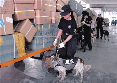 據(jù)了解,目前在西站所有托運的物品在經(jīng)過安檢儀的檢查后,還需經(jīng)過搜爆犬二次安檢。上午9點多,記者在西站貨物行李托運處看到,5只搜爆犬在訓(xùn)犬員的帶領(lǐng)下,對準(zhǔn)備托運的物品進(jìn)行再次檢查。與此同時,2名女訓(xùn)犬員的出現(xiàn)也引起許多車站工作人員的注意。據(jù)介紹,目前北京鐵路警方共有6名女訓(xùn)犬員,平均年齡只有23歲,她們和男鐵警5人一組,在四大車站進(jìn)行24小時的查危工作。這次也是女鐵警首次在公眾場合亮相,