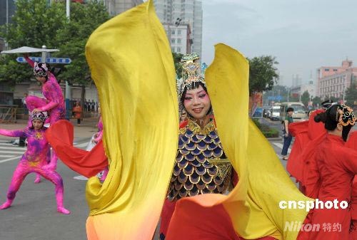 7月23日,奧運(yùn)火炬在山東濟(jì)南傳遞,人們?cè)谘赝颈硌菥⿷蚝碗s技?xì)g迎奧運(yùn)火炬到來。 中新社發(fā) 廖攀 攝