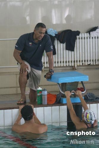 7月24日,參加北京奧運會的哥倫比亞游泳運動員在教練的指導(dǎo)下進行熱身訓(xùn)練。據(jù)悉,哥倫比亞共有5名游泳運動員和3名跳水運動員取得北京奧運會參賽資格。這些運動員將陸續(xù)從美國、加拿大趕赴天津,進行為期10天的集訓(xùn)。 中新社發(fā) 郭曉帆 攝