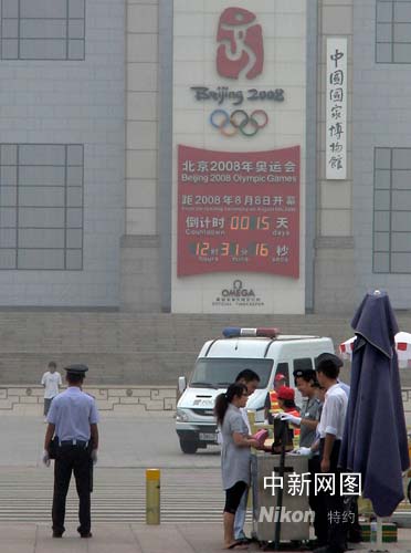 天安門廣場東部的奧運(yùn)會倒計(jì)時牌前保安依然嚴(yán)謹(jǐn)。作者:賈國榮