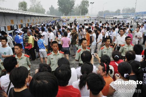 7月25日上午9點,最后82萬張北京奧運會比賽門票開始銷售。銷售現(xiàn)場異常火爆,購買門票的群眾分批進入等候,武警官兵一字排開維持現(xiàn)場秩序。中新社發(fā) 王宇婷 攝