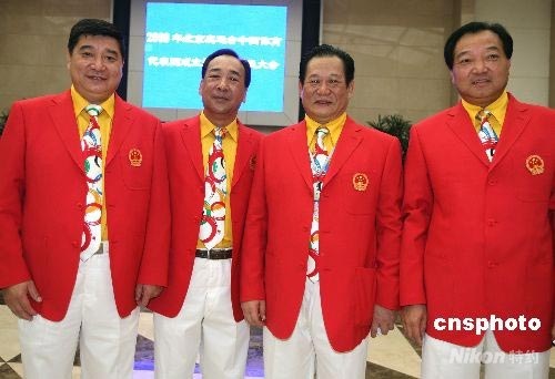 7月25日,參加北京奧運(yùn)會(huì)的中國(guó)體育代表團(tuán)正式成立,代表團(tuán)總?cè)藬?shù)共1099人,639名運(yùn)動(dòng)員將參加北京奧運(yùn)會(huì)28個(gè)大項(xiàng),38個(gè)分項(xiàng)的全部比賽。其中,國(guó)家射擊隊(duì)現(xiàn)任總教練王義夫、體操管理中心主任高健、舉摔柔運(yùn)動(dòng)管理中心主任馬文廣、中國(guó)首枚奧運(yùn)會(huì)金牌獲得者許海峰(從左至右)是代表團(tuán)中參加過七屆奧運(yùn)會(huì)的四大“七朝元老”。 中新社發(fā) 任晨鳴 攝