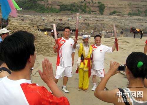 中新7月25日電(劉一 長(zhǎng)年)近日,聞名遐邇的山西吉縣黃河壺口瀑布迎來(lái)喜事,幾位參加過奧運(yùn)火炬?zhèn)鬟f的火炬手來(lái)到此間,舉行“迎奧運(yùn)壺口火炬展示”。