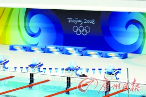 走進“水立方”,令人眼前一亮,最直觀的感覺就是這里氣派了。跳水臺的后面位置早已掛起了“BeiJing 2008”的巨幅背景圖。而在游泳池的另一側(cè),工人們也在抓緊時間安裝大屏幕。其實,早在今年年初的“好運北京”游泳測試賽時,這里就已經(jīng)安裝了一塊大屏幕。但在“水立方”的巨大空間里,當時無論是媒體還是運動員都感覺這塊大屏幕太小了,坐在靠近跳水池的最遠處根本無法看清楚大屏幕上顯示的圖像。為了能讓現(xiàn)場觀眾有更好的視覺感受,如今,原來那塊大屏幕旁又豎立起了一個大屏幕,而且還比原來的屏幕大了1/3。另外,游泳池兩側(cè)更是懸空掛上了兩個屏幕:“這邊3塊,加上跳水臺那邊也懸掛了一塊大屏幕,現(xiàn)在比起年初那會兒,一共多了4塊大屏幕,”程秀麗告訴記者,“我們不僅要為運動員營造一個好的比賽氛圍,更要為觀眾營造一個觀賽氛圍。”