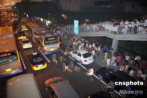 7月30日晚,北京奧運(yùn)開(kāi)幕式帶妝彩排,前來(lái)“鳥(niǎo)巢”觀看的外圍民眾陡增,位于“鳥(niǎo)巢”周邊的北四環(huán)車(chē)流人流增大。 中新社發(fā) 陳文 攝
