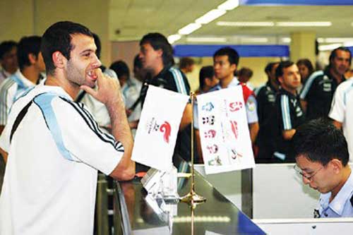 飛機(jī)比預(yù)定的時(shí)間晚到了幾分鐘,11時(shí)45分,阿根廷國奧隊(duì)的運(yùn)動(dòng)員走出機(jī)艙,他們談笑風(fēng)生,顯得非常輕松。通過檢測體溫區(qū)域后,馬斯切拉諾第一個(gè)站到了邊檢驗(yàn)證臺(tái)前!澳茫 边厵z民警用西班牙語向這位著名球員表示問候,并很快幫他辦理了入境通關(guān)手續(xù)。