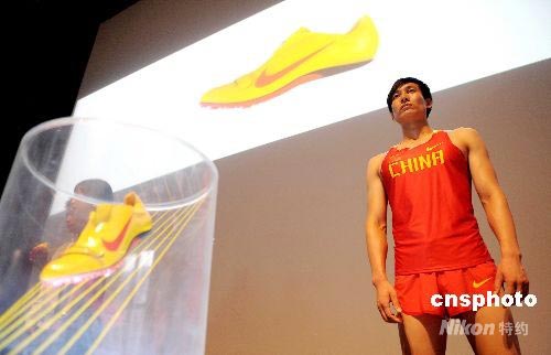 7月31日下午,劉翔的奧運(yùn)戰(zhàn)靴、戰(zhàn)袍亮相京城。此次劉翔征戰(zhàn)奧運(yùn)所穿的這款戰(zhàn)靴、戰(zhàn)袍均含有當(dāng)今世界最高科技成分,將有助于劉翔在“鳥巢”創(chuàng)造佳績(jī)。 中新社發(fā) 陳文 攝