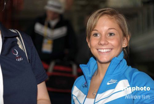 8月1日下午,美國女子體操隊運動員一行飛抵北京,其體操領(lǐng)軍人物肖恩.約翰遜、柳金等選手將征戰(zhàn)北京奧運會。 中新社發(fā) 陳文 攝