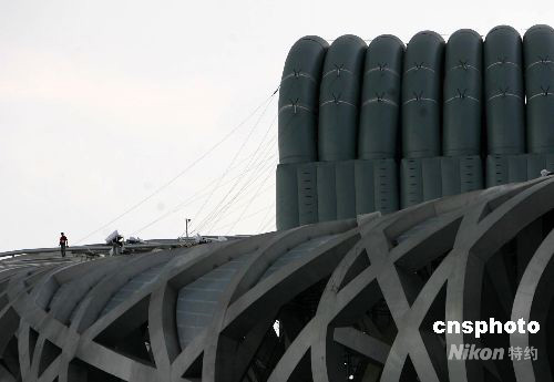 8月2日,北京奧運(yùn)會(huì)開(kāi)幕式第二次彩排在國(guó)家體育場(chǎng)“鳥(niǎo)巢”進(jìn)行。圖為工作人員在“鳥(niǎo)巢”頂部布置。 中新社發(fā) 武仲林 攝