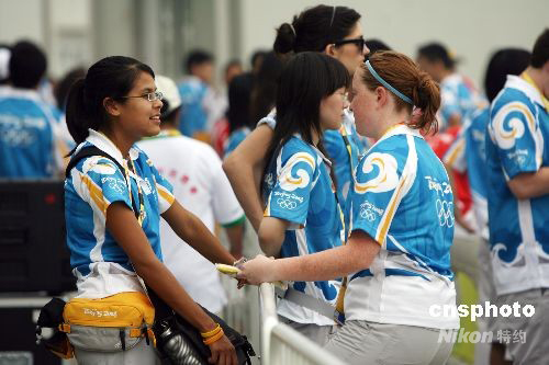 8月4日,幾名外國志愿者在北京奧運(yùn)會(huì)自行車賽場(chǎng)內(nèi)。從昨日起,200多名“百里挑一”的外籍志愿者經(jīng)過最后的培訓(xùn)后,開始在奧體中心場(chǎng)館群、奧運(yùn)村、主新聞中心等地參加志愿服務(wù),成為北京奧運(yùn)會(huì)數(shù)十萬名賽場(chǎng)志愿者中一道亮麗的風(fēng)景線。 中新社發(fā) 武仲林 攝