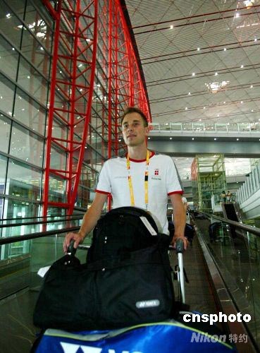 8月3日,丹麥著名羽毛球名將皮特·蓋德飛抵北京首都機場,備戰(zhàn)北京奧運。 中新社發(fā) 富田 攝