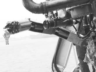 安裝在救生船后甲板的“水下機(jī)器人”通過(guò)專(zhuān)用吊車(chē)迅速潛入海中;遙控方艙內(nèi),士官廉法響、李明根據(jù)指令,嫻熟地操縱著遙控手柄,“水下機(jī)器人”在水中靈活機(jī)敏地游動(dòng)搜尋開(kāi)去。由于海底淤泥較深,加上“水下機(jī)器人”在海底的旋轉(zhuǎn)作業(yè),很快把海水?dāng)嚨脺啙岵磺。遙控人員迅即采用原地微調(diào)的辦法,操縱“水下機(jī)器人”繼續(xù)搜索。“水下機(jī)器人發(fā)現(xiàn)可疑目標(biāo)!”短短幾分鐘后,遙控方艙內(nèi)傳出了令人振奮的消息。彩色顯示屏前,記者看到,“水下機(jī)器人”伸出“機(jī)械手”,非常靈活地完成了伸、開(kāi)、抓、夾等各種動(dòng)作,牢牢地將可疑物———一只易拉罐握在了“手”中。也許是覺(jué)得打撈易拉罐的難度還不夠,有人又把一只手表扔進(jìn)了海中!八聶C(jī)器人”接到了出征命令,又一次潛入海底,利用自身攜帶的水下電視、圖像聲納,只用了不到15分鐘的時(shí)間就完成了探摸任務(wù)。