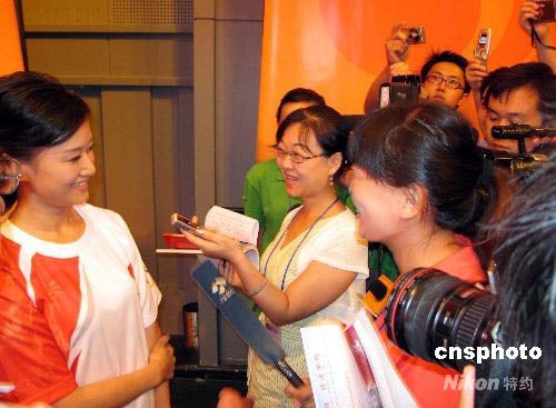 八月四日,奧運(yùn)火炬北京段傳遞路線和部分火炬手名單公布。中國知名歌唱家宋祖英在首場(chǎng)新聞發(fā)布會(huì)上亮相,宣布將擔(dān)任火炬手。宋祖英將出現(xiàn)在八月七日北京地壇火炬?zhèn)鬟f活動(dòng)現(xiàn)場(chǎng)。在此之前的火炬?zhèn)鬟f活動(dòng)中,較少出現(xiàn)火炬手提前曝光、與媒體會(huì)面的情形。中新社發(fā) 許曉青 攝