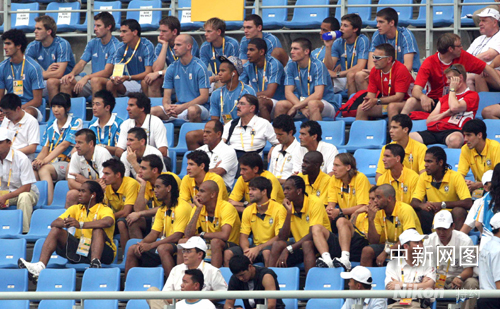8月6日,北京奧運(yùn)會沈陽足球分賽場女足預(yù)賽,巴西對德國0:0戰(zhàn)平。圖為巴西男足隊(duì)員觀看比賽。 中新社記者 張宇 攝