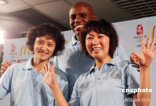 8月7日,在北京奧林匹克公園舉行了傳統(tǒng)的“巨無霸制作大賽”,并為比賽的優(yōu)勝者頒發(fā)“獎牌”。美國9枚奧運(yùn)短跑金牌得主卡爾·劉易斯、中國奧運(yùn)冠軍王軍霞、高敏,與麥當(dāng)勞全球奧運(yùn)團(tuán)隊(duì)成員等一起,共同參加了巨無霸漢堡制作大賽。圖為王軍霞(右一)、高敏(左一)與卡爾·劉易斯出席“麥當(dāng)勞巨無霸制作大賽”。 中新社發(fā) 錢興強(qiáng) 攝