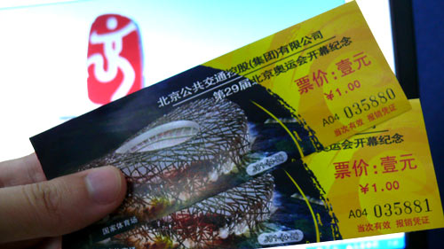 8月8日,2008北京奧運(yùn)會開幕普通紀(jì)念車票開始在北京市公交集團(tuán)所屬的全部公交線路上發(fā)售,乘客在京乘坐公交車時可以購買。