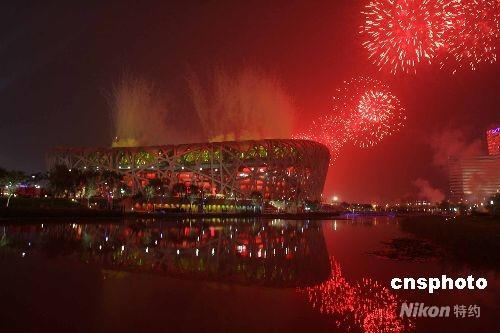 8月8日,第29屆夏季奧運(yùn)會(huì)在北京國(guó)家體育場(chǎng)開幕,絢麗的煙火映紅北京的夜空。中新社發(fā) 武仲林 攝