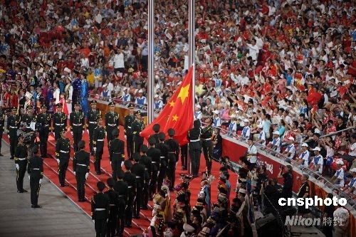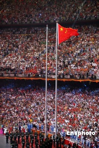 圖:北京奧運(yùn)會開幕 中國國旗迎風(fēng)飄揚(yáng)