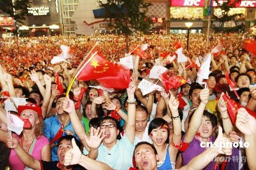 8月8日晚,北京奧運(yùn)會(huì)盛大開幕。中外游客自發(fā)聚集在北京王府井大街觀看大屏幕電視直播的奧運(yùn)會(huì)開幕式盛況,舞動(dòng)手中的五星紅旗、北京奧運(yùn)會(huì)會(huì)旗為中國加油喝彩、為奧運(yùn)狂歡。中新社發(fā) 鄭雄增 攝