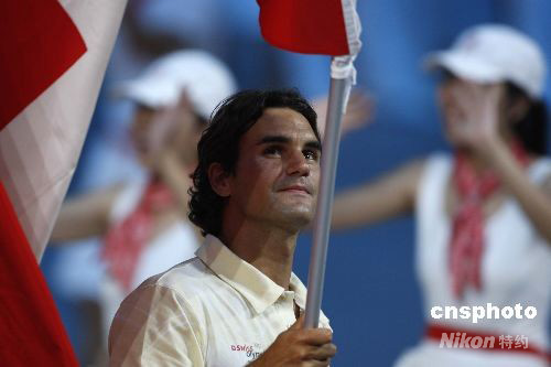 8月8日,第29屆夏季奧運會在北京奧林匹克公園內(nèi)的國家體育場“鳥巢”開幕。各個奧運代表團(tuán)的旗手都是該國的體育明星。圖為瑞士奧運代表團(tuán)旗手“網(wǎng)球天王”費德勒。 中新社發(fā) 杜洋 攝