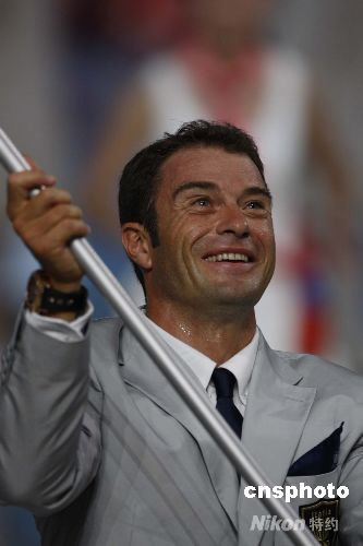 圖為入場(chǎng)儀式上意大利奧運(yùn)代表團(tuán)旗手皮劃艇名將羅西。中新社發(fā) 杜洋 攝