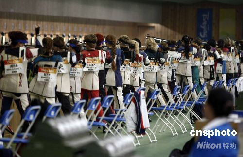 8月9日,北京奧運會開賽的第一天,女子10米氣步槍資格賽率先在北京射擊館拉開戰(zhàn)幕。30多個國家的47名選手在17到63號靶位比試槍法,資格賽前8名進入最后決賽。按照賽程,女子氣步槍賽場極可能產(chǎn)生本屆奧運會的首枚金牌。圖為來自各國的女神槍手參加預(yù)賽。中新社發(fā) 盛佳鵬 攝