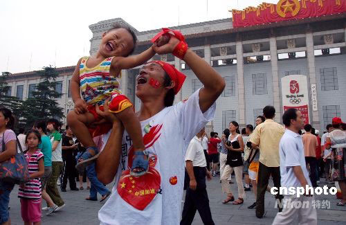 8月8日,第二十九屆夏季奧運(yùn)會(huì)在北京開幕。當(dāng)天下午,萬人匯聚天安門廣場為奧運(yùn)狂歡。中新社發(fā) 張雙雙 攝