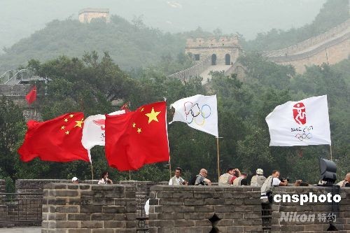 圖為奧運旗幟在長城上高高飄揚。中新社發(fā) 武仲林 攝