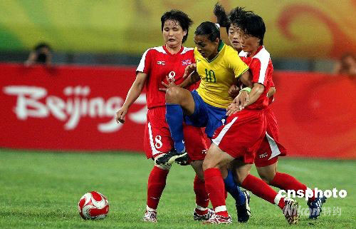8月9日,北京奧運(yùn)會(huì)沈陽(yáng)分賽場(chǎng)舉行女足預(yù)賽,巴西隊(duì)2:1勝朝鮮隊(duì)。比賽中,巴西隊(duì)瑪塔被朝鮮隊(duì)嚴(yán)防。中新社發(fā) 張宇 攝