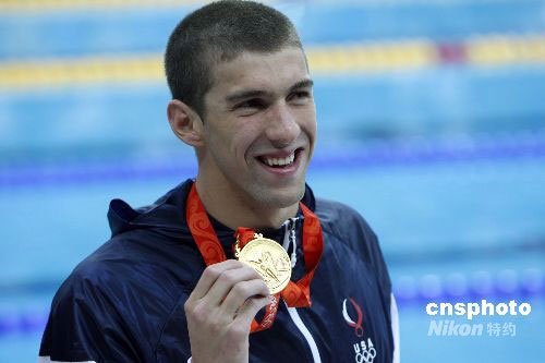 8月10日,美國選手菲爾普斯獲得北京奧運會男子400米個人混合泳冠軍,菲爾普斯以4分3秒84打破了他個人保持的男子400米個人混合泳世界紀錄,這是北京奧運會上第一項被刷新的世界紀錄。中新社發(fā) 杜洋 攝