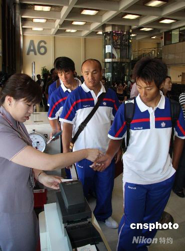 中華臺北棒球隊(duì)三十人于八月十日上午十時四十分,乘班機(jī)離臺赴北京參加奧運(yùn)會。圖為隊(duì)員在登機(jī)口驗(yàn)票。 中新社發(fā) 曾嘉 攝