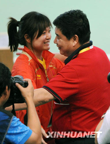 8月10日,中國(guó)選手郭文珺(左)與中國(guó)射擊隊(duì)總教練王義夫擁抱,慶祝勝利。當(dāng)日,在北京奧運(yùn)會(huì)射擊女子10米氣手槍比賽中,中國(guó)選手郭文珺獲得金牌。 新華社記者 李尕?cái)z