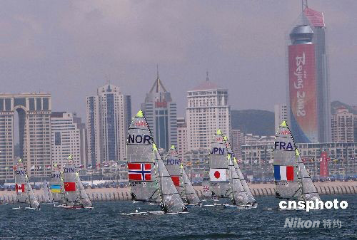 北京2008奧運(yùn)帆船比賽8月10日繼續(xù)在青島舉行,各國的參賽帆船出發(fā)的場面成為一道風(fēng)景線。 中新社發(fā) 趙振清 攝