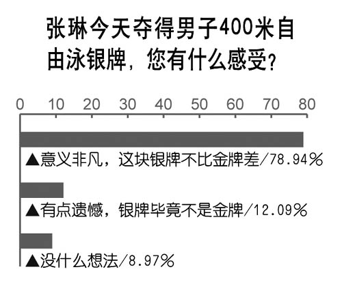 同時,公眾高度評價張琳奪得男子400米自由泳銀牌。78.9%的人認(rèn)為這塊銀牌“意義非凡,不比金牌差”。只有12.1%的人表示“有點遺憾,銀牌畢竟不是金牌”,另有9.0%的人表示“沒什么想法”。