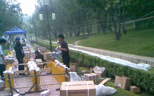 8月8號,早6時30分,負責(zé)安裝煙花的工人來到了現(xiàn)場,開始對煙花進行安裝調(diào)試。在安裝調(diào)試的過程中,出現(xiàn)了一個問題,由于現(xiàn)場有很多樹,部分樹枝可能會阻擋煙花發(fā)現(xiàn)的路徑,導(dǎo)致煙花不能正常發(fā)射,甚至造成火災(zāi)。為了防止這種事故的發(fā)生,消防官兵對發(fā)射炮一一的做了檢查,認真計算其發(fā)現(xiàn)的軌道,盡量避免在發(fā)射軌道中出現(xiàn)樹枝等阻擋物。如果遇到實在不能避免的樹枝,即迅速與當(dāng)?shù)叵嚓P(guān)人員聯(lián)系,給與解決。通過大家的統(tǒng)統(tǒng)努力,所有的煙花在8月8號上午11點50分完成了安裝調(diào)試。到這時,消防官兵已經(jīng)連續(xù)工作了15個小時,但是消防官兵知道現(xiàn)在還不能休息,只有到煙花綻放在空中那一刻,才能真正地放下心來。