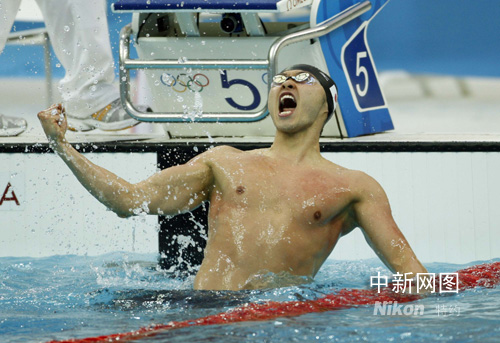 8月11日,在北京奧運(yùn)會游泳男子100米蛙泳比賽中,日本選手北島康介以58.91秒成績打破世界紀(jì)錄奪得該項(xiàng)目冠軍。中新社發(fā) 杜洋 攝