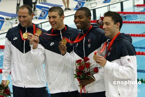 8月11日,美國隊奪得北京奧運會男子4x100米自由泳接力金牌,并打破該項目世界紀(jì)錄。 中新社發(fā) 杜洋 攝