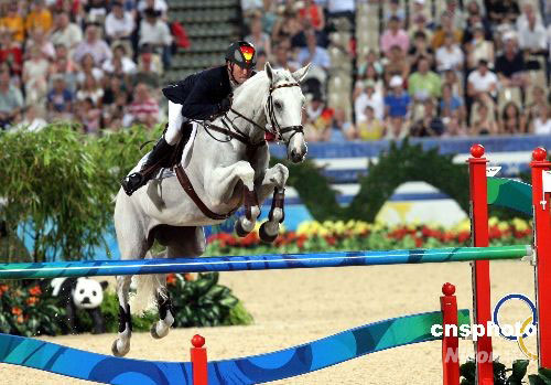 八月十二日,在香港舉行的奧運(yùn)馬術(shù)三項賽進(jìn)行最后一項場地障礙賽,德國選手欣里!け颂亍ち_邁克獲得個人賽金牌。中新社發(fā) 洪少葵 攝