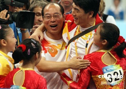 8月13日,北京奧運(yùn)會(huì)女子體操團(tuán)體決賽在北京奧林匹克公園內(nèi)的國家體育館舉行,由程菲、何可欣、江鈺源、李珊珊、楊伊琳、鄧琳琳組成的中國體操女隊(duì)創(chuàng)造歷史,以總成績188.900分摘取桂冠,奪得中國體操歷史上第一枚奧運(yùn)會(huì)女子團(tuán)體金牌。圖為掛上金牌的小姑娘們與中國體操管理中心主任高健及全體教練合影。中新社發(fā) 任晨鳴 攝