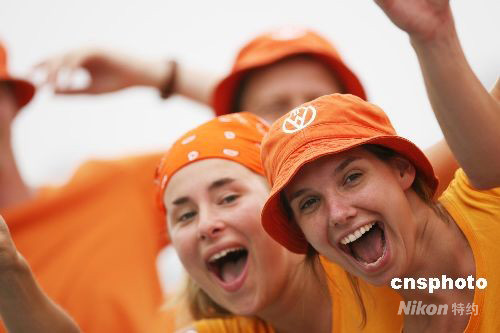 8月13日,北京奧運會棒球比賽開賽,中華臺北隊在揭幕戰(zhàn)中以5:0完勝荷蘭隊。圖為激情荷蘭球迷現(xiàn)場助威。中新社發(fā) 武仲林 攝