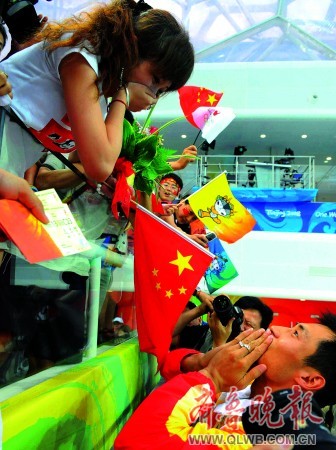 此時(shí),看臺(tái)上的王丹已經(jīng)哭得像個(gè)淚人,王峰溫柔地為妻子抹去臉上的淚水。這一刻,“水立方”浪漫滿屋?粗匀蝗滩蛔〉魷I的愛人,王峰雙手獻(xiàn)上“飛吻”,然后向新聞發(fā)布廳走去。